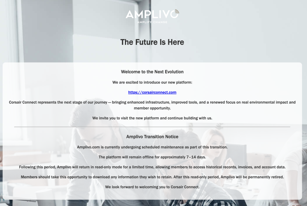 Next time you log in to your Amplivo account you will see the message below. To create your CORSAIRCONNECT account, click on the blue link and follow the steps required using you current Amplivo login information. This will take you to your new, fully integrated CorsairConnect.com back office.